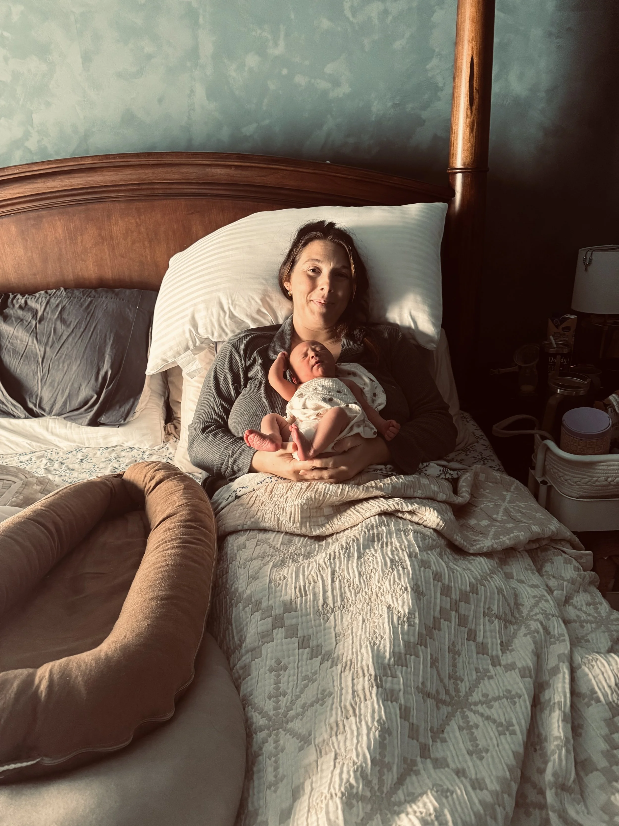 As I’m lying in bed my body completely starts to take over. I receive periods of rest where I am able to doze off to then be awoken by my baby strongly working their way through my pelvis. It feels like I have no control over my body, going back and forth from tapping into my breath and moaning deeply affirming myself it is temporary and I would soon be meeting my baby to guttural and visceral sounds beyond my control. My birth keeper and husband held space and also provided physical comforts.